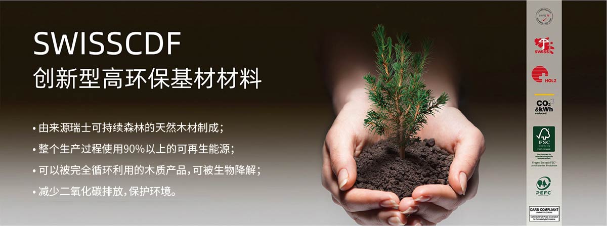 SWISSCDF作为新一代创新型环保基材,集坚固、防潮、阻燃、抗冲击、抗划伤等诸多优异性能于一体,极大拓展了该类材料以往的应用范围,可满足更多创意需求。