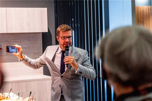△SWISS KRONO 瑞士卢森集团营销总监FabianKölliker展会现场演示AR应用程序的使用