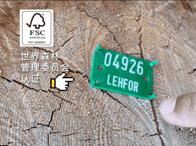 不仅如此,每一根木材也都有一个世界森林管理委员会FSC认证标识,它表明所有原木都经过了世界森林管理委员会认证,且全部来自于可追溯的欧洲原始森林,而且在砍伐原木的过程中,会维护生态系统的平衡,以保持木材的循环利用。